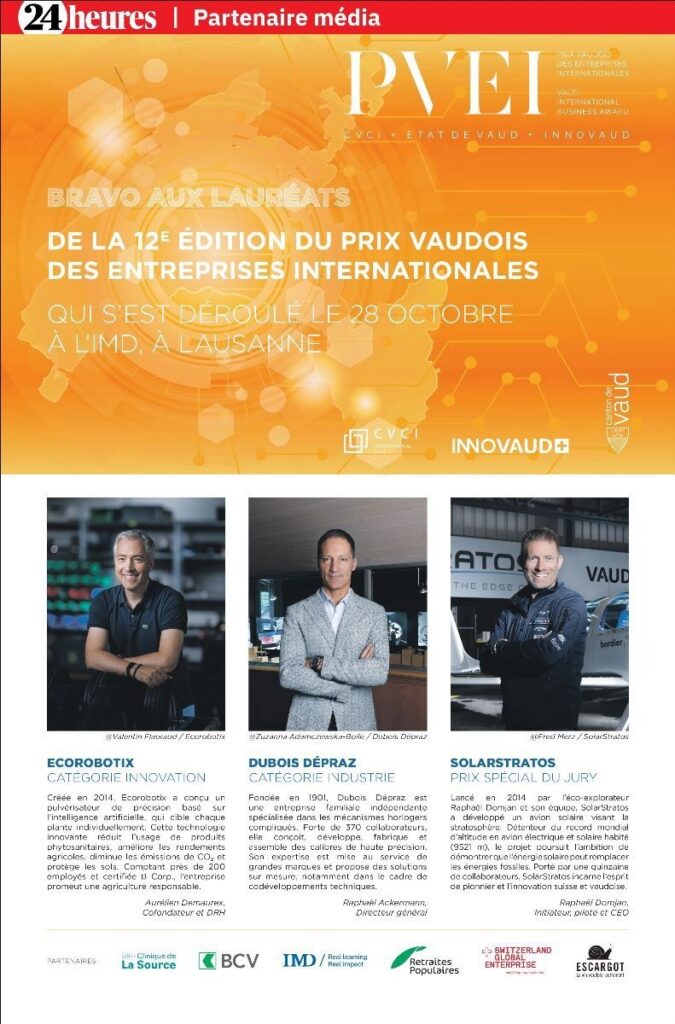 Félicitations à Ecorobotix pour son engagement en faveur d’une agriculture plus durable, et à Dubois Dépraz pour son excellence industrielle et son savoir-faire horloger.