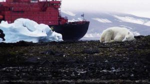 «L’image, tirée du documentaire «Cargos, la face cachée du fret», est forte et le message très encourageant. Alors que l’industrie des transports maritimes a toujours refusé d’être soumise au protocole de Kyoto,prétextant l’impossibilité technique de réduire ses gaz à effet de serre, l’Organisation maritime internationale a annoncé la signature d’un accord visant à réduire d’au moins 50% les émissions de CO2 du transport maritime par rapport à 2008 d’ici à 2050. Avec une estimation de 1,8 milliard de tonnes de CO2, soit trois fois les émissions du trafic aérien, le secteur maritime a une large part de responsabilité face aux changements climatiques. Cet engagement est donc réjouissant.» Une image tiré du documentaire «Cargos, la face cachée du fret». (Photo: Denis Delestrac / RTS)